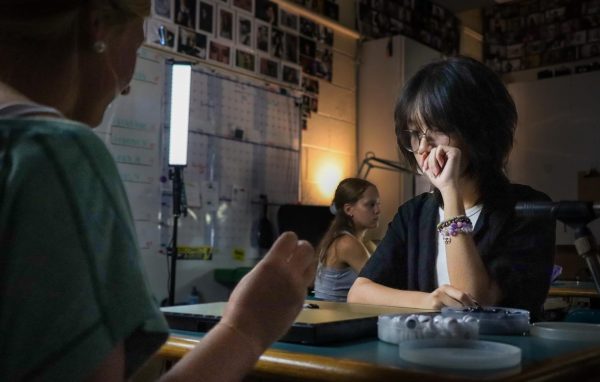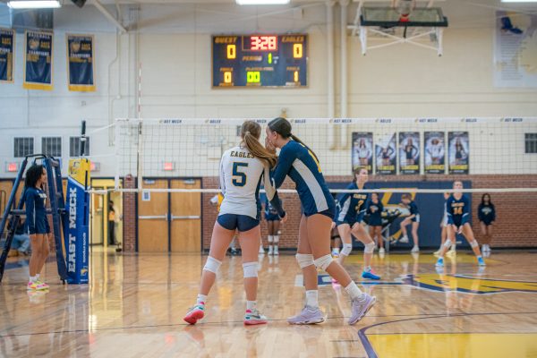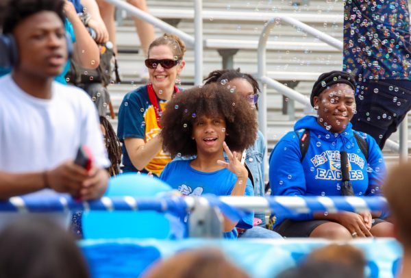 Riley Ketterhagen and Jane Young share secrets on the volleyball court before their game against Independence High School. Ketteragen and Young are two of the team’s most integral players, their positions being libero and outside hitter. (Photo by Maela Bazemore)Vian Nguyen plays Madeline Topham in a game of Gomoku. The objective f the game is to be the first to align five in a row. (Photo by Finn Boggs)La’shon Austin enjoys the bubbles at the East Mecklenburg High School pep rally. Students filled the stands with cheers, music, and giggles to celebrate school sprit. (Photo by Finn Boggs)